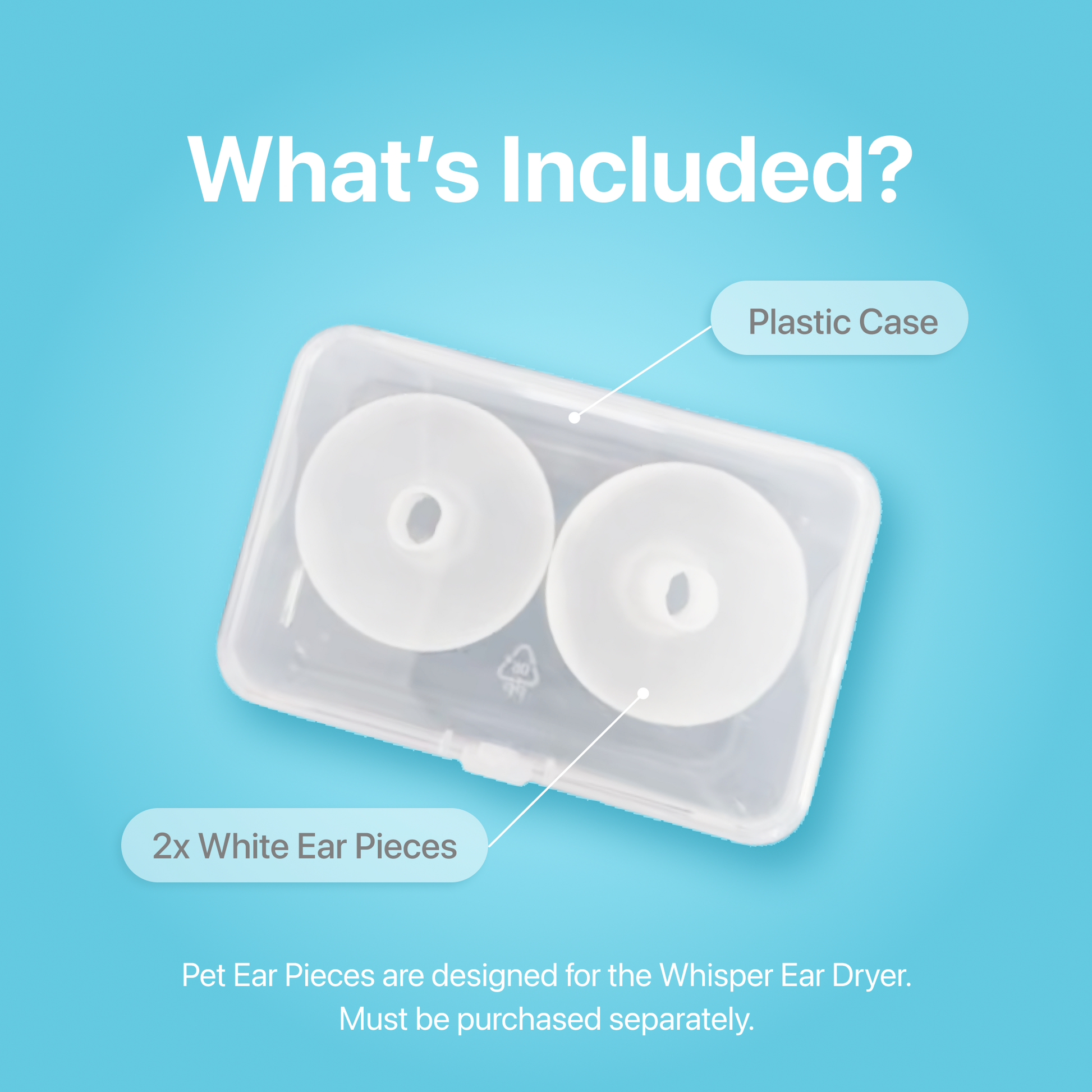 Soft silicone ear pieces designed to adapt the Whisper Ear Dryer (sold separately) for safe use with pets. The set includes two ear pieces that enable gentle, warm air drying of dog ears after swimming or bathing. They provide a comfortable and effective solution for maintaining healthy, dry ears in pets.